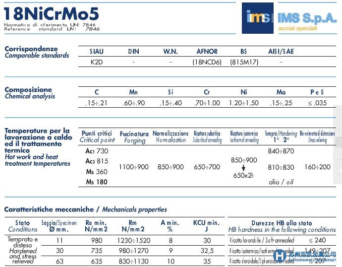 18Nicrmo5合金鋼性能用途、密度硬度和化學成分: 蘇州浩凱鄭重提示:我公司所經銷鋼材產品均為正品,可應客戶要求隨貨附帶質保書,為確保材質材料確保有效,恕不提前提供相關質保書,以免用作其他用途,敬請諒解。客戶所采購材料隨時可去檢驗部門化驗成分。八年以來,蘇州浩凱金屬材料有限公司以卓越品質在中國模具鋼行業占得一席之地,不以低價謀取訂單,不以劣貨供應,讓客戶蒙受莫大損失,讓我們的客戶價比三